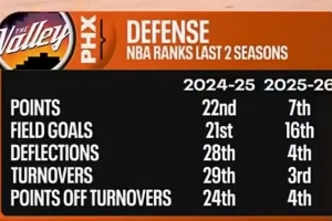 本赛季太阳在失分、对手进球数、场均干扰防守次数、造对手失误、利用失误得分等多项数据上,相比上赛季都有巨大提升,多项数据联盟前列。