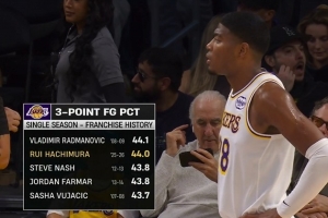 转播方给出了本赛季八村塁的三分命中率,为44%(本场比赛前),暂列湖人队史第二高,仅次于弗拉迪米尔·拉德曼诺维奇的44.1%。