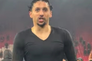 巴黎队长马尔基尼奥斯赛后与球迷互动,面对热情的球迷,已经送出球衣的他脱下球裤扔向看台。